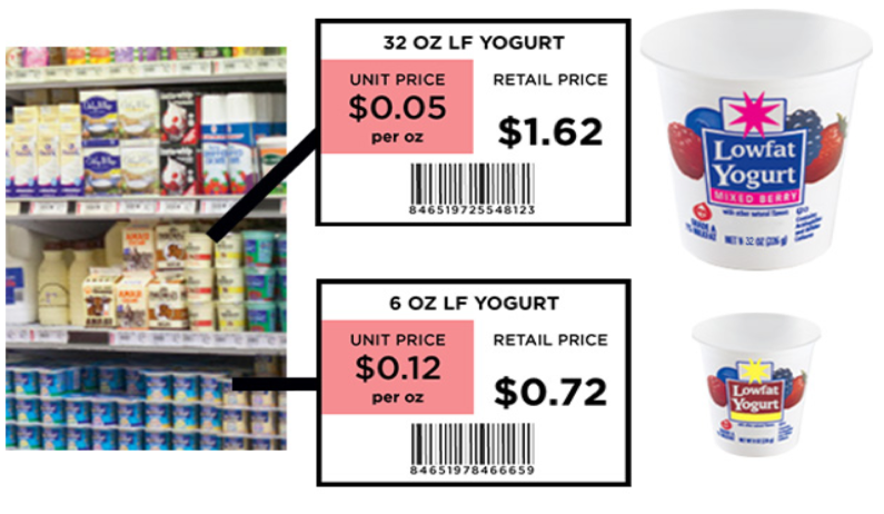 Most price tags at a large supermarket will have multiple numbers on it. Of course, there is the “retail price” - the price you will actually pay. However, there is often a second figure - the “unit price.” The unit price gives you how much you are spending on the product per unit, such as per pound, per ounce, per liter, etc. In fact, in Massachusetts, large retailers are required by law to tell you the per-unit price to help consumers make better decisions.